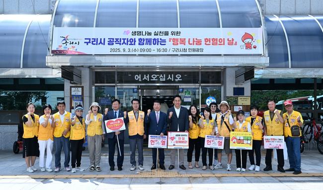 구리시(시장 백경현)는 9월 3일 대한적십자사 서울동부혈액원(원장 박기홍)과 상호 협력해 구리시청, 구리시체육관, 구리농수산물도매시장 등 3개소에서 행복 나눔 헌혈 행사를 실시했다.