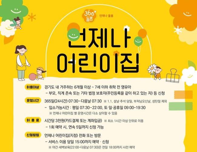 고현숙 경기도 보육정책과장은 "맞벌이 가정이나 돌봄 공백이 생긴 부모님들이 언제든 안심하고 아이를 맡길 수 있도록 `언제나 어린이집`을 지속적으로 확대하겠다"며 "앞으로도 부모의 양육 부담을 줄이고 아이들이 안전하고 행복하게 성장할 수 있는 포용적 보육환경 조성에 최선을 다하겠다"고 말했다.