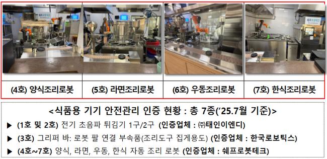 식품의약품안전처는 7월 10일, 자동으로 돈까스 · 라면 등을 조리하는 조리로봇 4종에 대해 `식품용 기기 안전관리 인증`을 완료했다고 밝혔다.