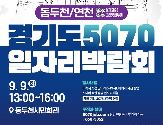 경기도와 경기도일자리재단은 오는 9일 동두천시민회관에서 `2025 경기도 5070 일자리박람회 in 동두천+연천`을 개최한다.