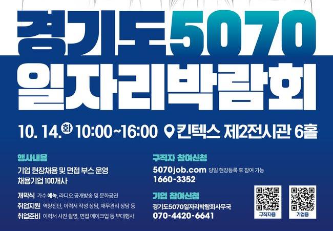 이번 행사는 중장년 특화 일자리사업인 ‘경기 5070 그레잇잡투어’의 일환으로, 남·북부 광역 박람회와 시군 지역박람회 등 연말까지 지속적으로 추진된다.