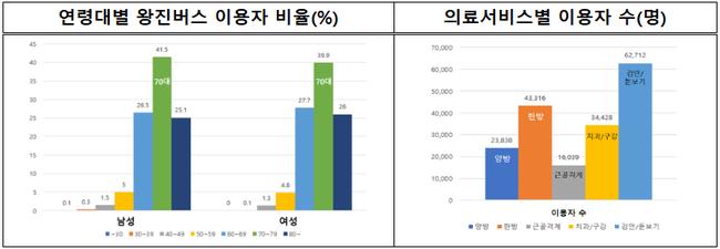 사업 효과도 가시적으로 나타나고 있다. 왕진버스 이용자는 2024년 9만1,000명에서 2025년 18만 명으로 2배 증가했다. 이용자의 93.5%는 60대 이상 고령층이며, 특히 70~79세 비중이 40.6%로 가장 높았다. 서비스별 이용 현황은 양·한방 진료가 6만7,154명으로 가장 많았고, 검안·돋보기 제공 6만2,712명, 치과·구강관리 3만4,428명이 뒤를 이었다. 2025년 새로 도입된 근골격계 진료도 1만6,039명이 이용해 농촌 주민의 높은 수요를 반영했다.