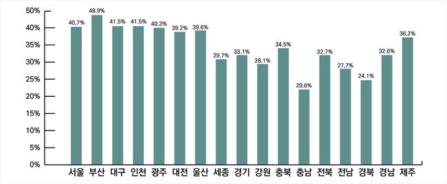 시도별 5급 여성공무원 비율(`24년말 기준, 단위:%)