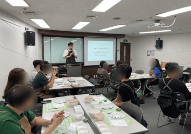 메시(전준혁) 도예강사가 도자식기 꾸미기 활동을 소개하고 있다