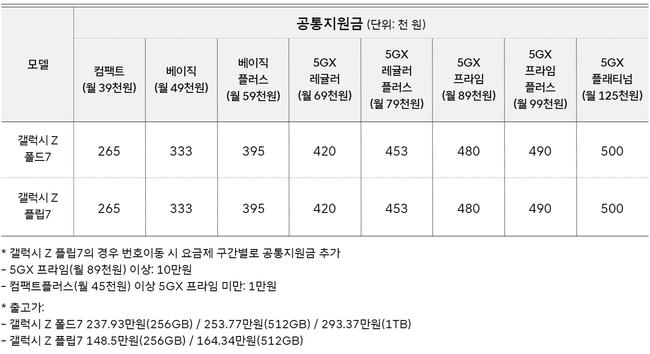 SK텔레콤 갤럭시 Z 폴드7 · 플립7 공통지원금 (SKT 제공)
