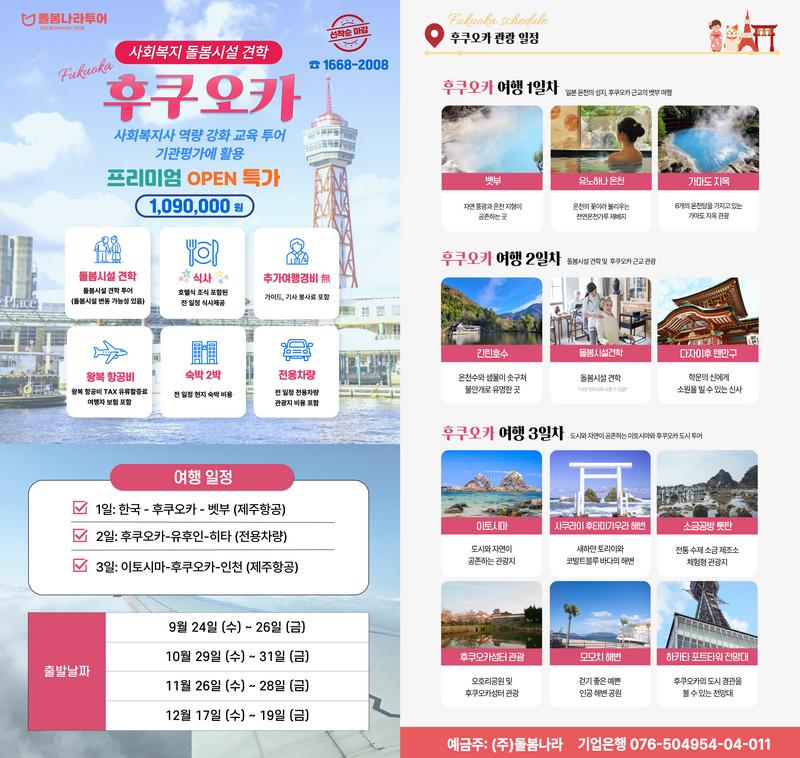 이번 여행은 단순한 관광이 아닌 일본 사회복지 현장을 직접 경험할 수 있는 실속형 연수 프로그램으로, 후쿠오카 지역의 돌봄시설 2곳을 공식적으로 견학할 수 있는 특별한 일정이 포함되어 있다. 특히 참가자는 가이드비, 기사비, 추가 경비까지 모두 포함된 ‘추가 비용 無’ 패키지로 불필요한 지출 없이 알찬 여행을 즐길 수 있다.
