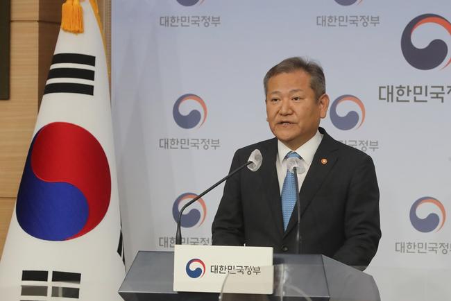 이상민 행정안전부 장관이 2022년 7월25일 오전 서울 종로구 정부서울청사 별관 브리핑룸에서 경찰국 신설 관련 총경회의에 대한 행정안전부 입장문 발표를 하고 있다.
